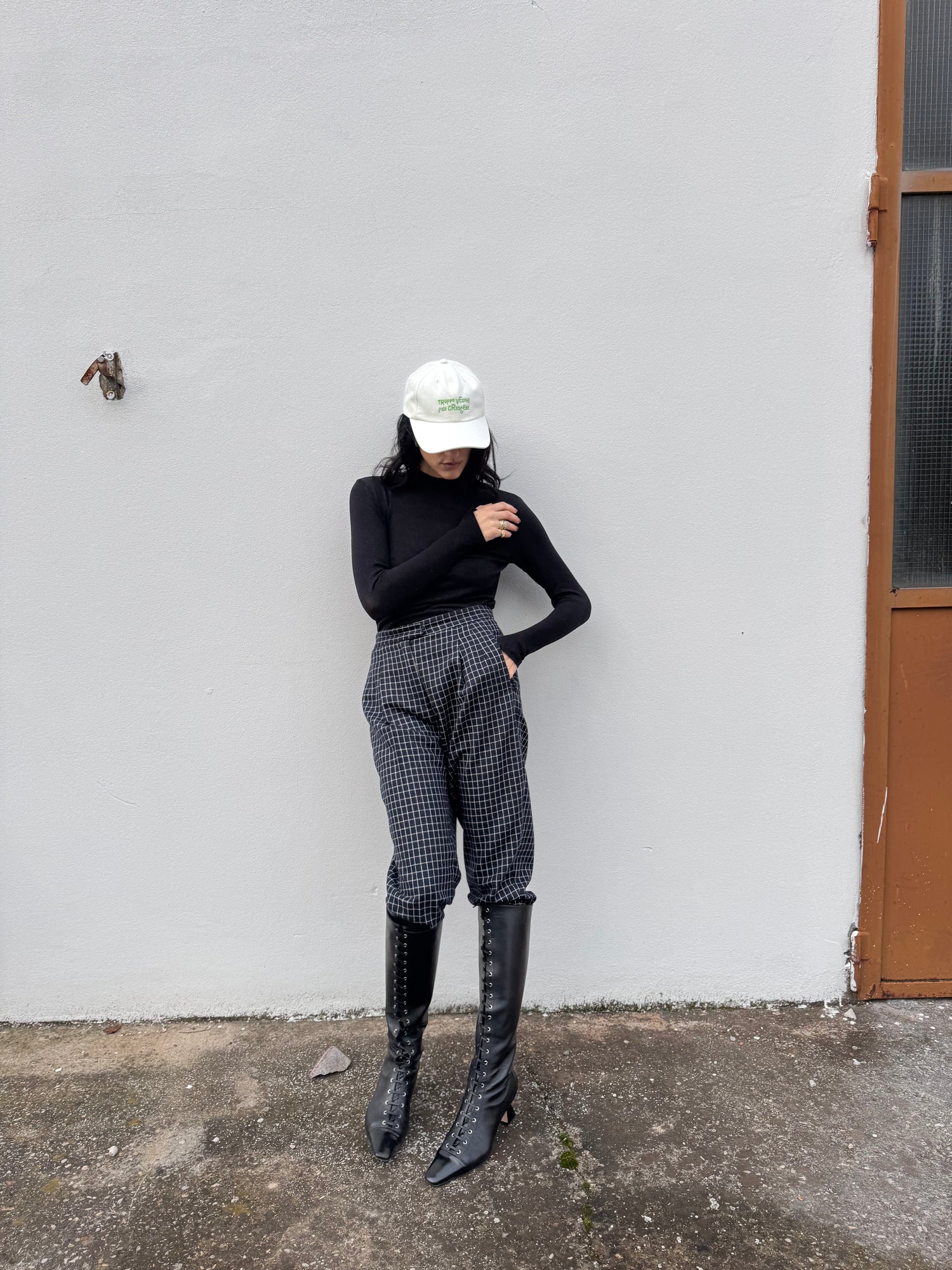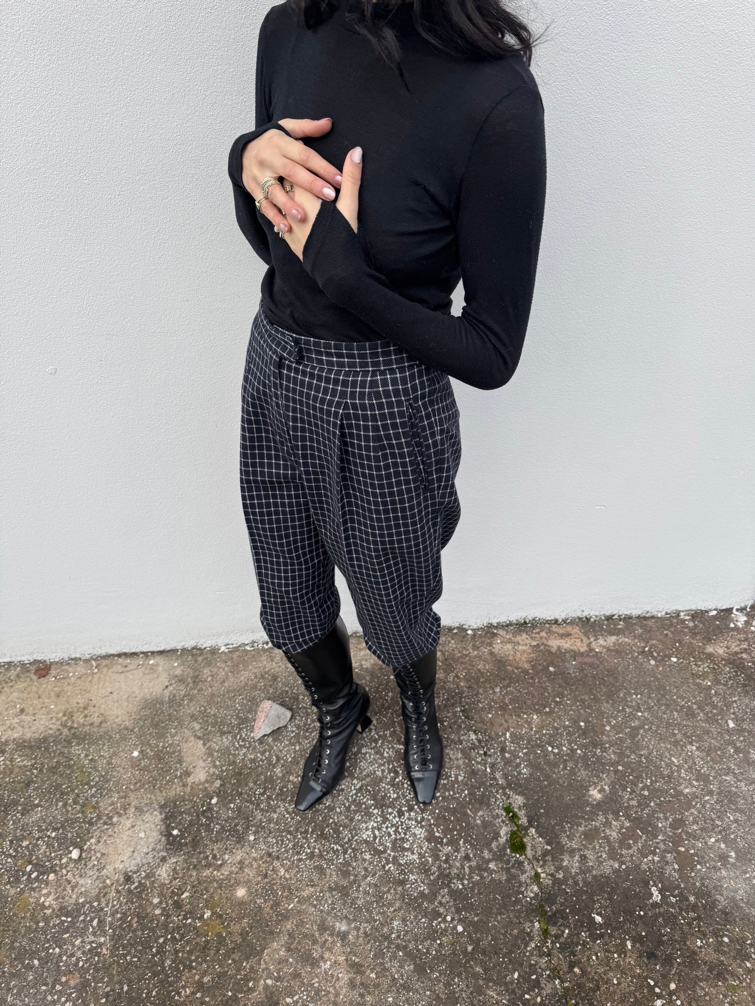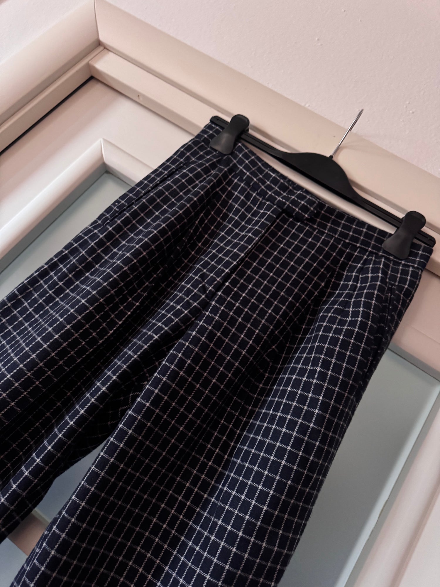 Pantaloni carrot a quadri con pinces sul davanti, in misto lana.