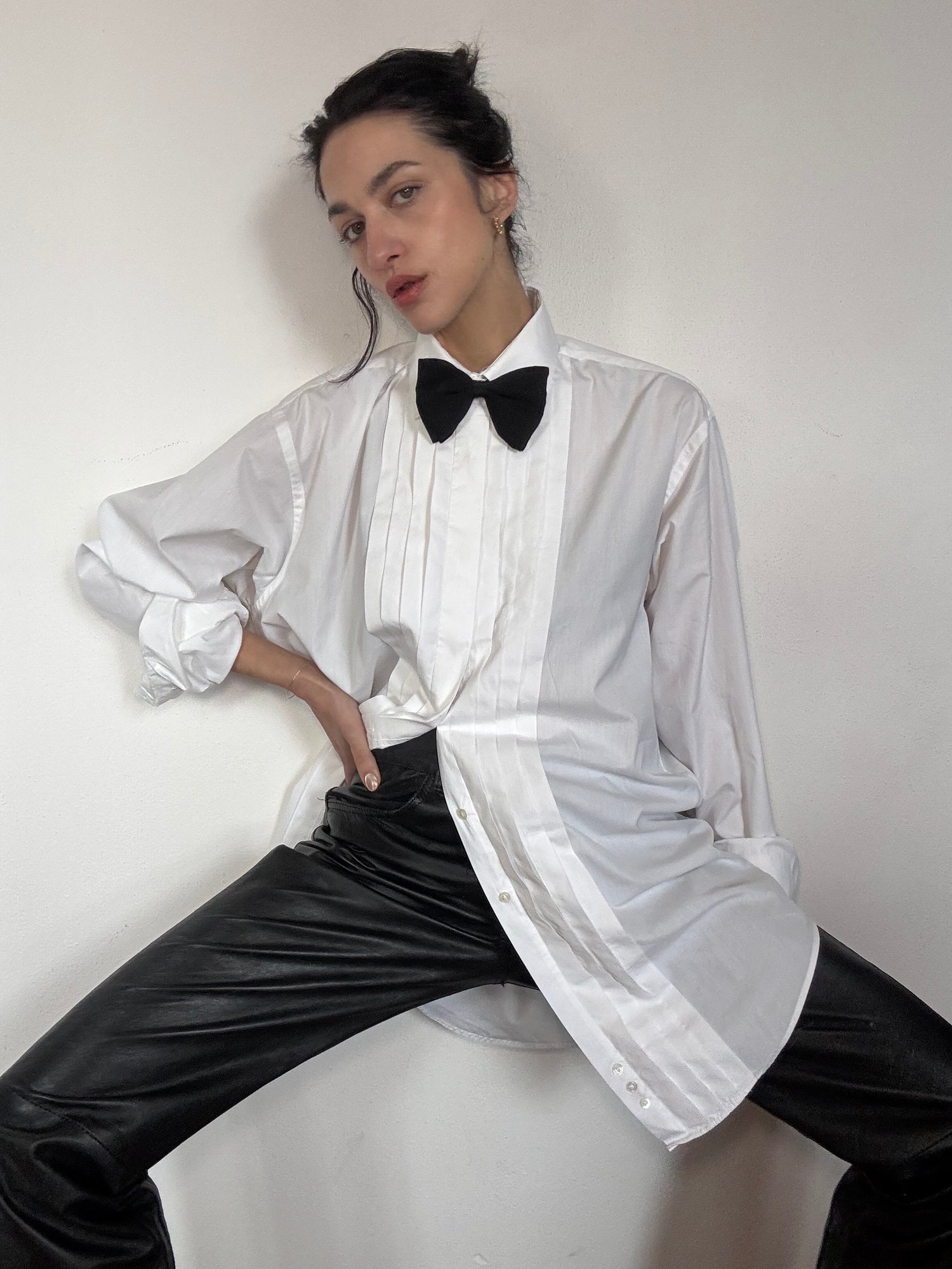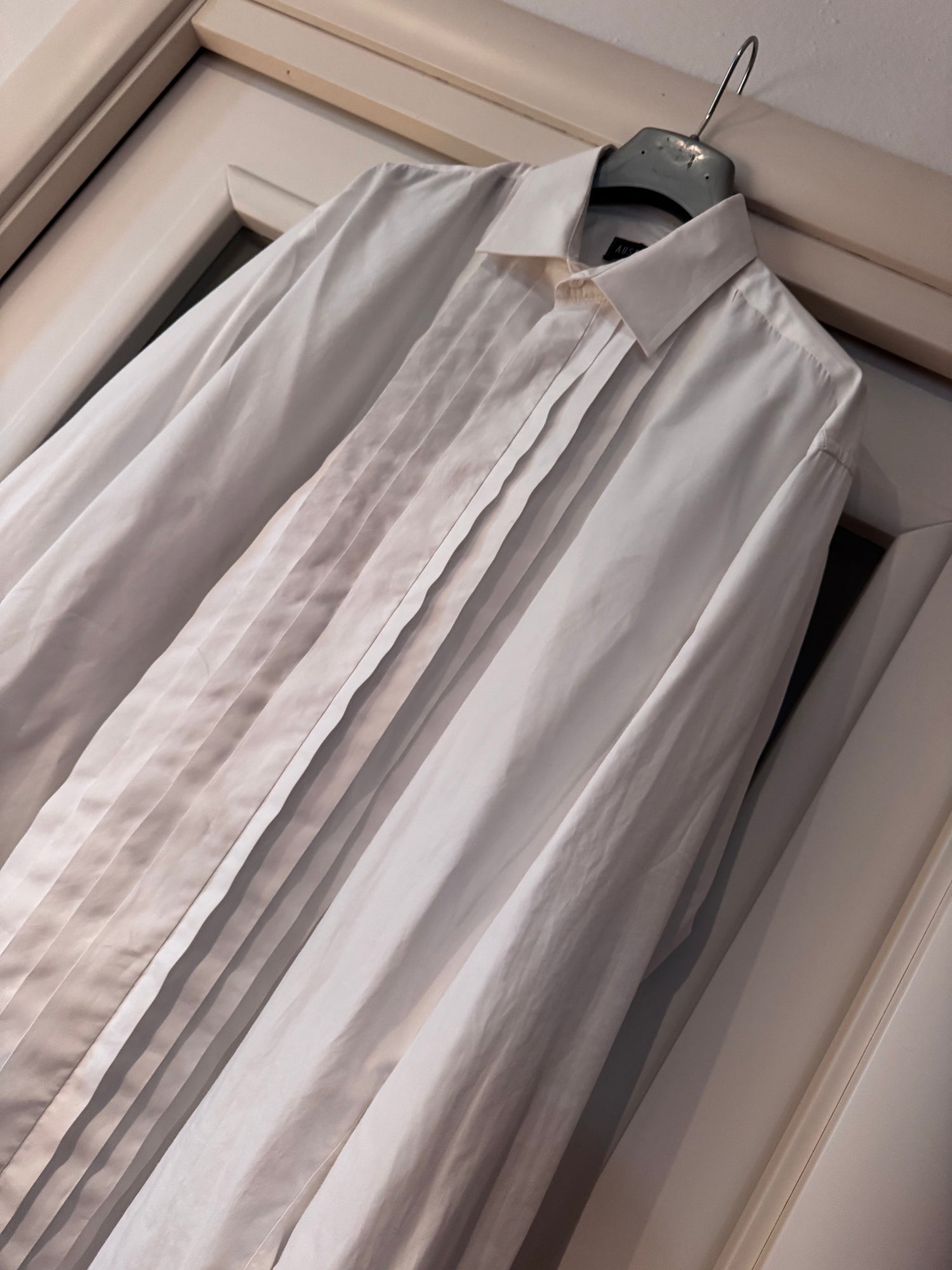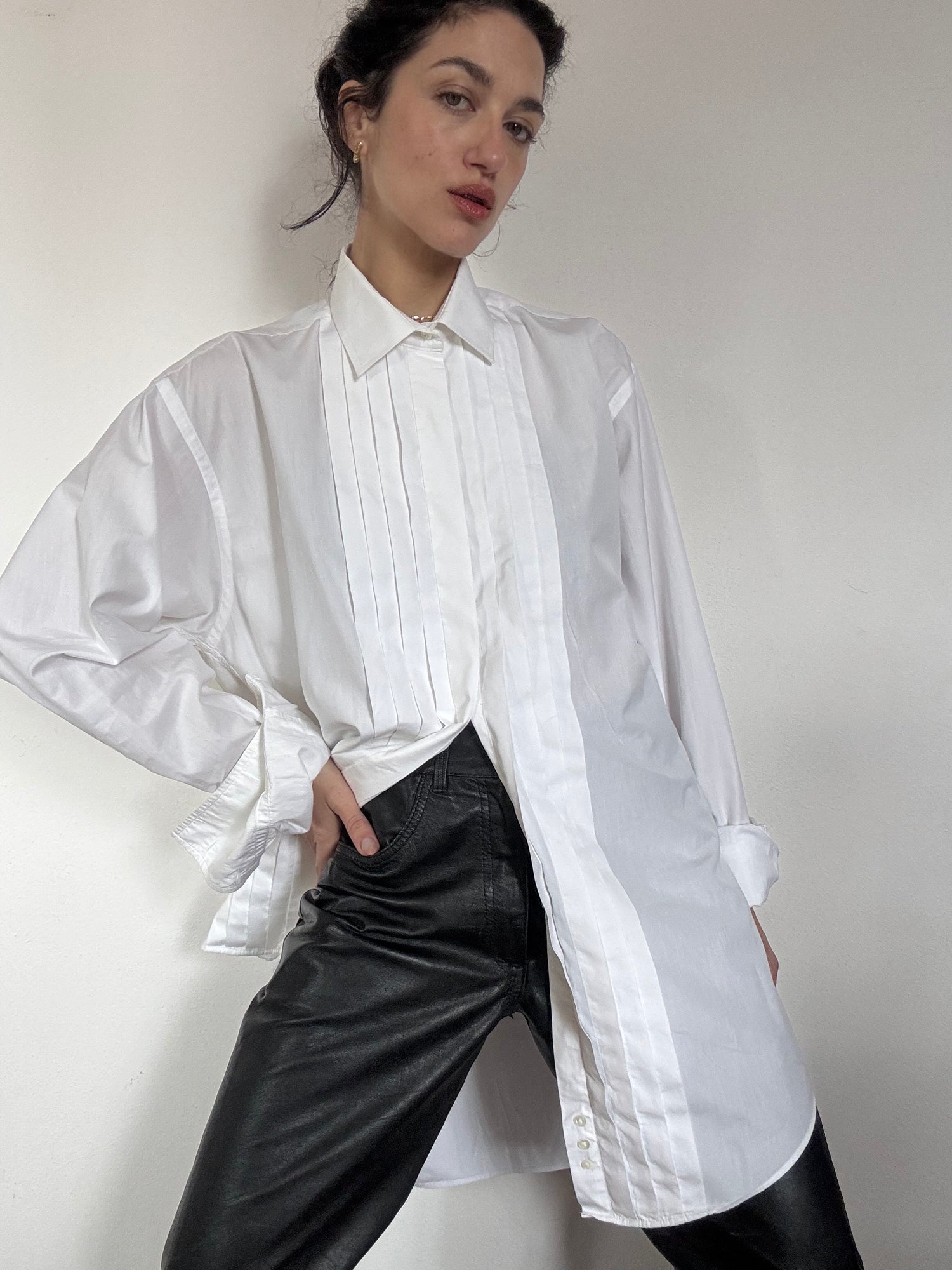 Camicia elegante che nasce come capo da uomo in 100% cotone con dettaglio plissè sul davanti.